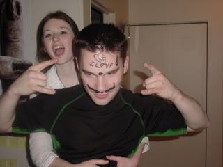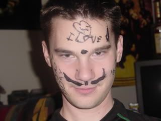 Yeah, it's bad. I let it happen though. There's a mustache, and on the left it says "Happy 23rd Bday." Right side says "Meow!" and has a heart next to it, my forehead says "I love" and then theres a pointy cock. The heart, I have no clue what it says. And there's a hindu dot on my forehead. Classy.